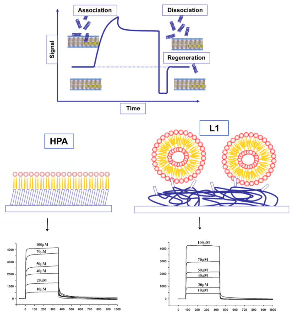 Surface Plasmon Resonance (SPR) and use of different chips for the study of peptide membrane interactions: L1 and HPA. Due to structural differences between the two chips, it is possible to distinguish between surface adsorption in the HPA chip and insertion into the hydrophobic core of the membrane in the L1 chip.