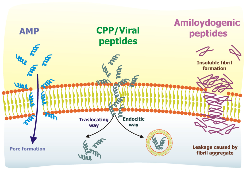 Membrane translocation is a necessary step for membrane permeabilization, and in fact, CPPs and AMPs are very similar molecules, and although being treated differently, both interact with the bilayer. At high concentration, peptides reported as CPPs perturb the membrane and become membrane permeabilisers, whereas at low concentrations, AMPs may reach cytoplasmic targets before membrane permeabilization. Cellular membranes of target cells where the activity of these two classes of peptides are evaluated are quite different. In fact, CPPs are evaluated against mammalian cells, whereas the target of AMPs is the bacterial cell. The bacterial membrane has a higher percentage of negatively charged lipids and does not contain sterols, thus, different effects reported with CPPs and AMPs can arise from the differences in membrane composition, and other factors which modulate peptide affinity and membrane destabilization. Another class of membranotropic peptides that is an object of active research for the design of novel delivery tools is represented by viral-derived peptides.