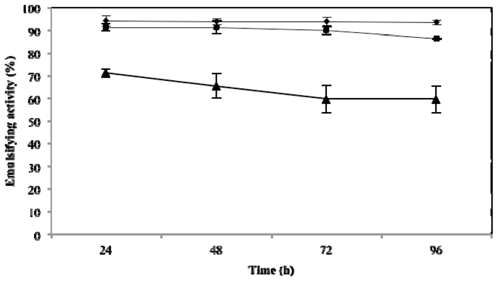 The effect of these three key variables that influence emulsifying activity was assessed at 24, 48, 72 and 96 h. As expected, they influenced the emulsifying activity of microbactan, but their effects occurred at different levels. A time-dependent decrease of emulsifying activity was observed at 100 °C (F = 38.13; p < 0.005). This was not the case for activities at 50 °C and 5 °C. The highest level of activity was found at 50 °C (emulsifying activity of 95.7% ± 2.5%) irrespective of time of incubation (Figure 1). The loss of emulsifying activity at 100 °C can be explained by denaturation of the protein fraction of microbactan during heating [22], as seen with other microbial biosurfactants [23]. Similarly, the activity associated with the upper limit of the range of salinities tested (3.5%, 5%, and 10%) declined as a function of time to level off at 72 and 96 h. The highest levels of activity were observed at 3.5% (Figure 2), not dissimilar to the biosurfactant produced by Aeromonas spp., which maintained emulsifying activity up to 5% NaCl [24]. On the other hand, no significant effect on activity was observed as a function of time with the pH values tested (Figure 3). However, slightly higher levels of emulsifying activity were recorded at acid and alkaline pH values, suggesting the ionization of functional groups that resulted in the activation of less surface-active species within the bioemulsifier matrix [25]. In comparison, biodispersan from Acinetobacter calcoaceticus A2 had an optimum functional pH value in the range of 9 to 12 for limestone-dispersing activity [26]. It has been shown that the emulsifying activity of certain polymers is modified at different extents when temperature and pH covariate, this is probably due to the synergistic influence of these factors on surface-active proteins, whose conformation and functional groups are influenced as a function of these factors.