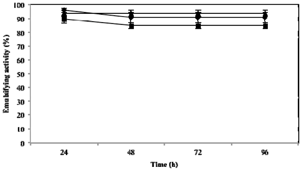 Emulsifying activity of microbactan on motor oil at different temperatures up to 96 h. 5 °C (●), 50 °C (■) and 100 °C (▲). Values represent means ± SD (n = 3).