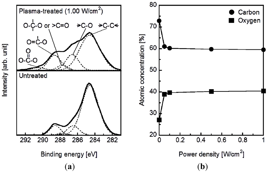 The plasma surface modification introduced oxygen-containing functional groups to the specimen surface according to the results of X-ray photoelectron spectroscopy (XPS). Figure 1a displays the C1s XPS spectra of the surfaces of the plasma-treated (1.0 W/cm2) and untreated plate specimens. The C1s peaks (solid line) from the plasma treated and untreated specimens were resolved into five peaks (dotted line), which were attributed to the carbon atoms in –C–C–, –C–O–, –C=O/–O–C–O–, –O–C=O, and –O–C(=O)–O– [27,28]. The peak intensity of the methylene carbon decreased and the intensities of all of the other peaks increased following the plasma treatment. This result can be attributed to the cleavage of the methylene and ester linkages on the specimen surface to produce oxygen-containing functional groups such as hydroxyl, carbonyl, and carboxyl groups. According to the surface composition analysis, the density of the oxygen-containing functional groups on the specimen surface increased with increasing plasma power density up to 0.1 W/cm2 and saturated at higher plasma power densities (Figure 1b).