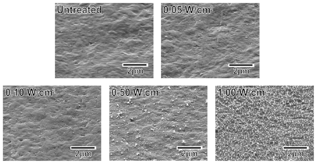 SEM images of the surfaces of the untreated and plasma-treated (0.05–1.00 W/cm2) plate specimens.