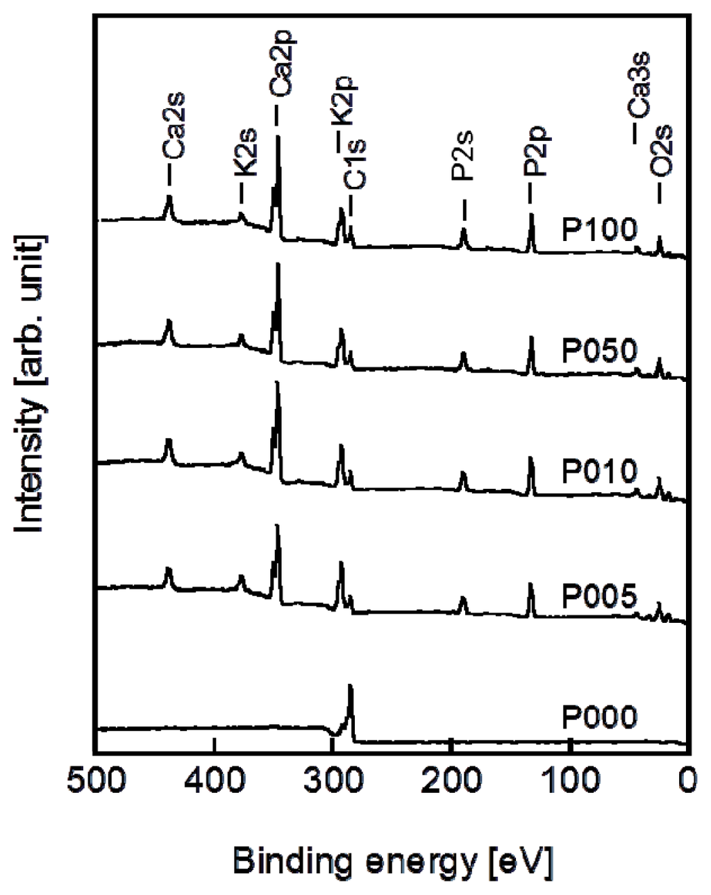 XPS spectra of the surfaces of the plate specimens P000, P005, P010, P050, and P100.