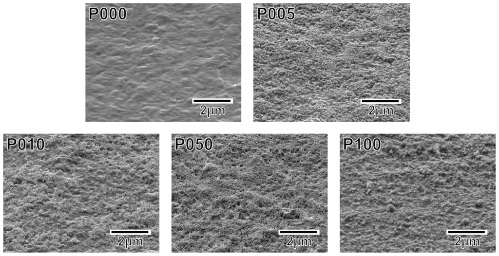 SEM images of the surfaces of the plate specimens P000, P005, P010, P050, and P100.