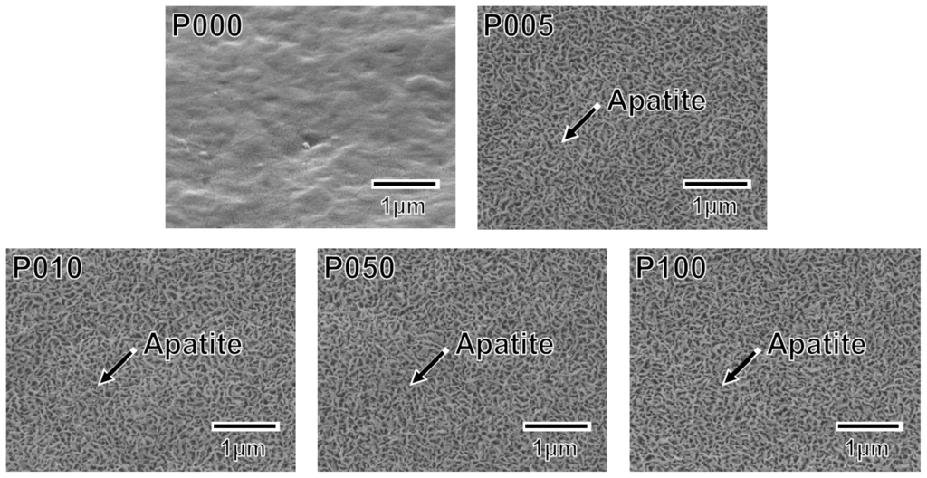 A thin coating of apatite formed on the ACP-precoated plate specimens (P005, P010, P050, and P100) following a 24 h immersion in SBF (Figure 5). The apatite coating exhibited a nano-porous structure and covered the entire surfaces of the specimens. According to the results of thin-film X-ray diffractometry (TF-XRD), this coating layer was composed of low-crystalline apatite [30] (Figure 6). On the P000 plate specimen without the ACP precoating, no coating layer was observed following the immersion in SBF (Figures 5 and 6). These results correspond well with our previous results from other polymer substrates [15–18,26].