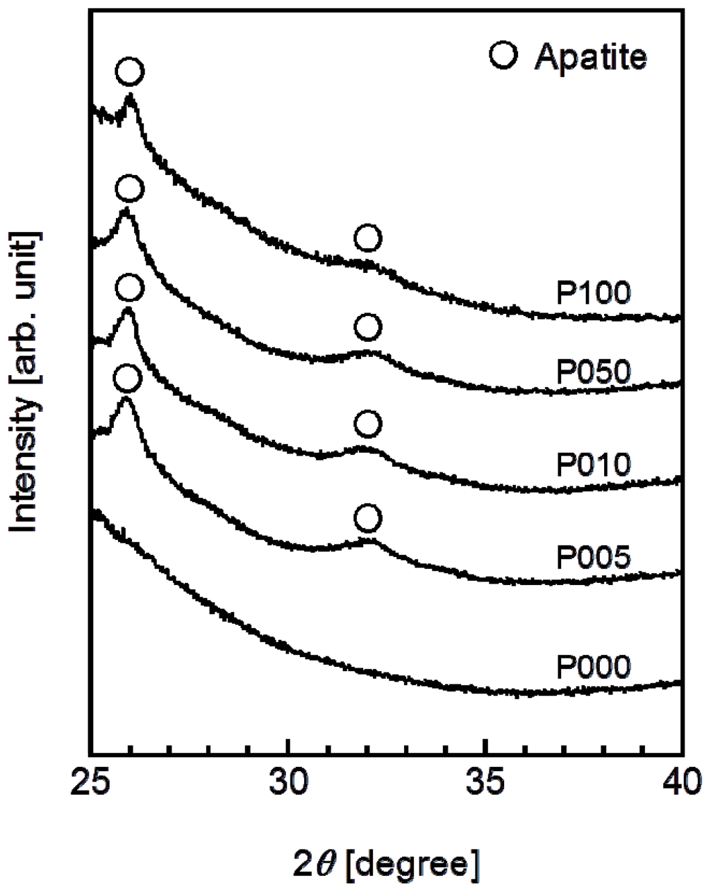 TF-XRD patterns from the surfaces of the plate specimens P000, P005, P010, P050, and P100 following immersion in SBF for 24 h.