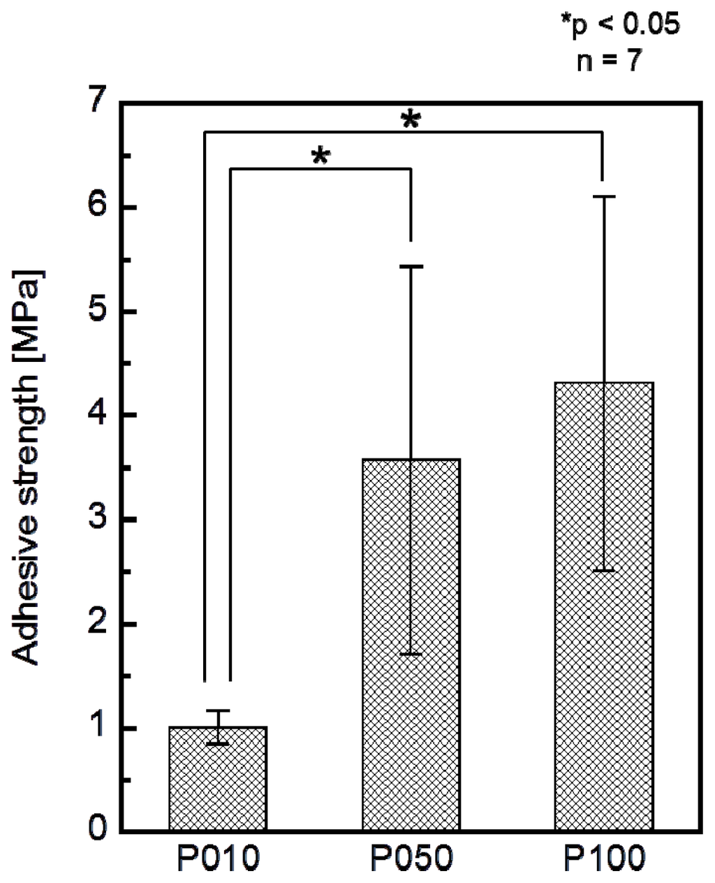 Adhesion strengths of the apatite coatings to the surfaces of the plate specimens P010, P050, and P100 (n = 7, *p < 0.05).