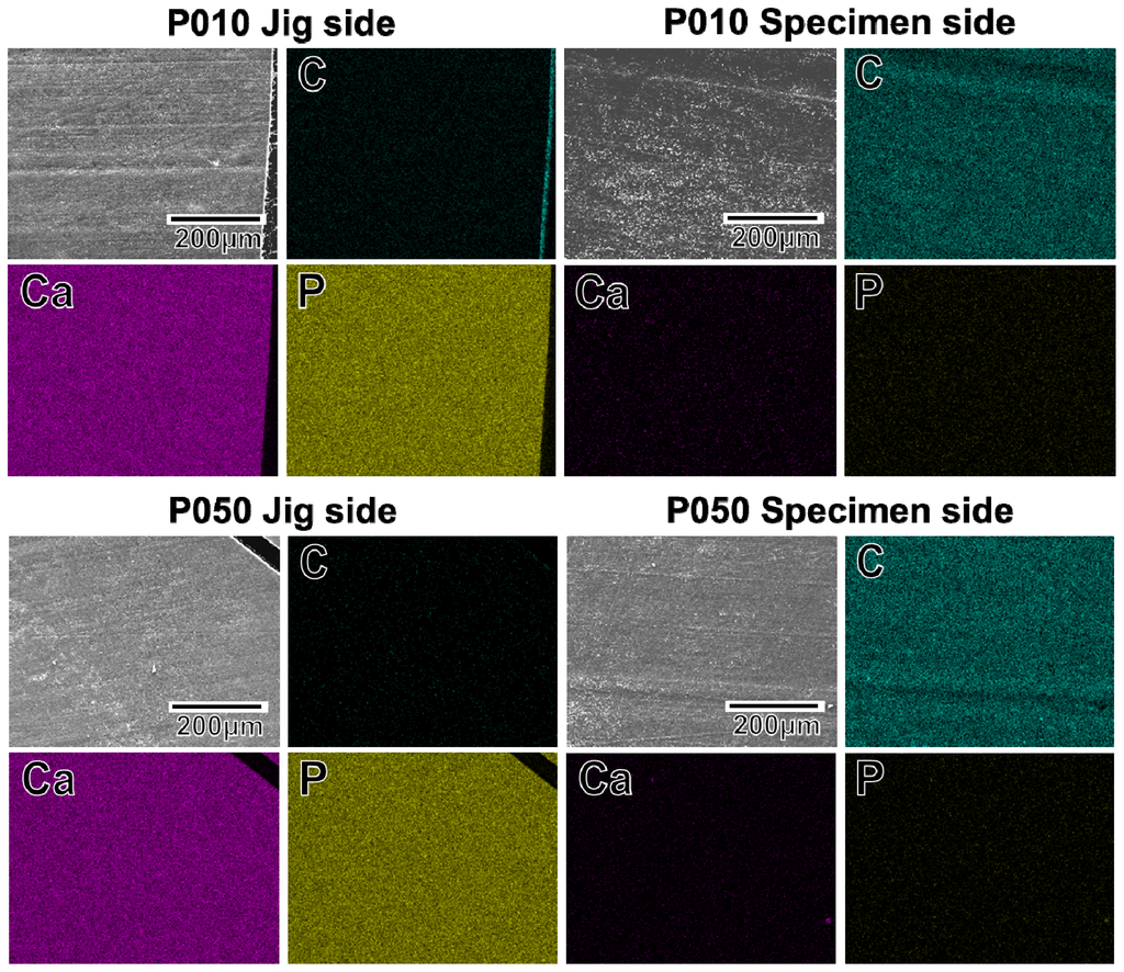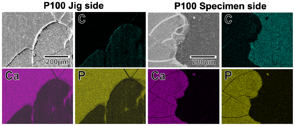 The adhesion strength of the apatite coating to the plate specimen improved with the use of increasing plasma power density for the plasma surface modification. P005 was excluded from the adhesion strength measurement based on the results of a screening test in which the coating layer detached from the specimen surface using a Scotch® tape-detachment test. The apatite coatings on the plate specimens treated with higher plasma powers (P010, P050, and P100) remained adhered even after the tape-detachment test and were therefore subjected to the quantitative adhesion strength-measurement. It can be observed in Figure 7 that the adhesion strengths of the apatite coatings to the P050 and P100 surfaces were significantly higher than that to the P010 surface (p = 0.0015 and p < 0.0001, respectively). The average adhesion strength of the apatite coating to the P100 surface was higher than that to the P050 surface, although the difference was not statistically significant. According to the energy dispersive electron probe X-ray analysis (EDX) of the fractured surfaces, the fracture occurred at the coating-specimen interface for P010 and P050. For these specimens, Ca and P, which are component elements of apatite, were detected by EDX on the jig side, whereas they were not detected on the specimen side (Figure 8). The fracture in P100 occurred not only at the coating–specimen interface but also at the coating–glue interface. In the case of P100, a splintered layer composed of Ca and P was observed on both the jig and the specimen sides (Figure 8).