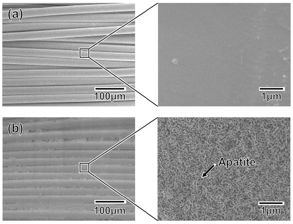 An apatite coating layer was successfully deposited on the mesh specimen as well as on the plate specimens. Figure 9 displays SEM images of the surfaces of (a) the untreated (as-prepared) mesh specimen and (b) the P100 plasma-treated mesh specimen following a 24 h immersion in SBF. As displayed in Figure 9b, the individual fibers composing the artificial ligament were fully coated with a continuous thin-film apatite layer exhibiting a nano-porous structure similar to that formed on the plate specimens (see P100 in Figure 5).
