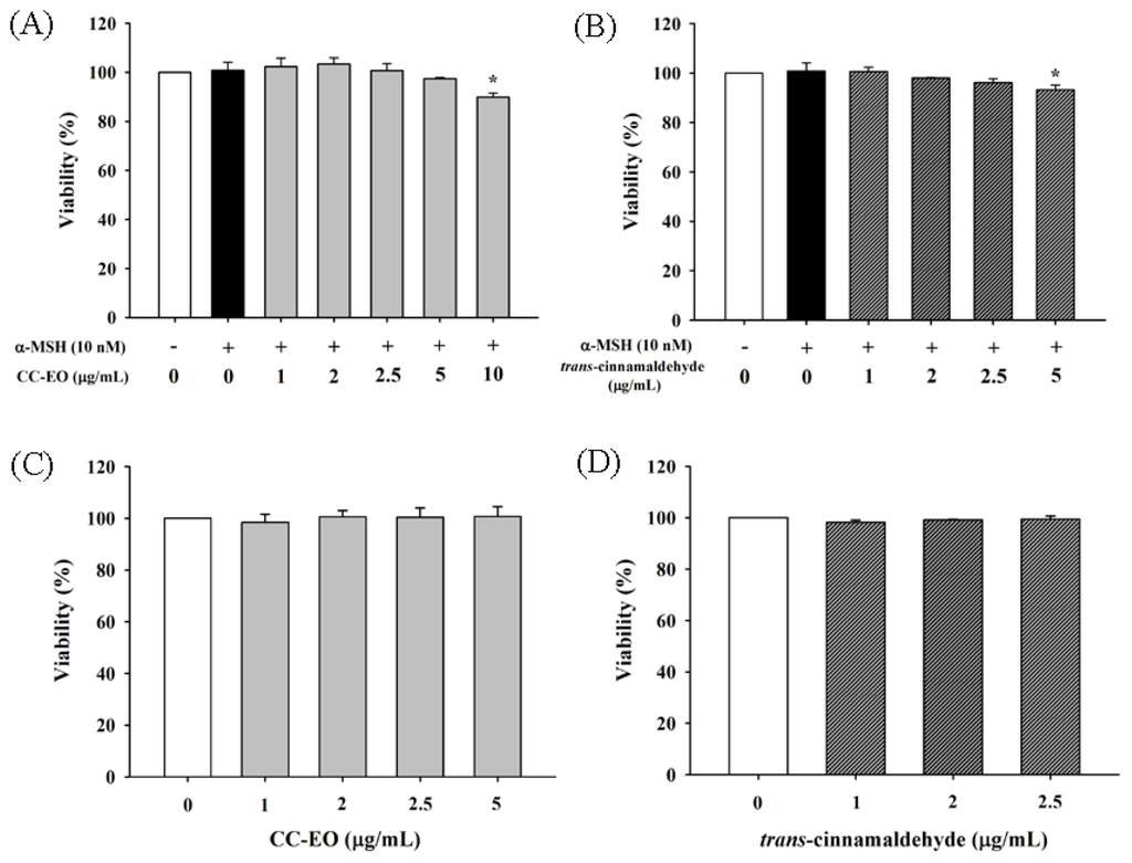 The effects of CC-EO and trans-cinnamaldehyde on the cell viability of α-MSH-treated B16 cells (A,B) and WS-1 cells (C,D), respectively. The data are represented as the means ± S.D. of three independent experiments. * indicates a significant difference (p < 0.05) compared with the untreated group.