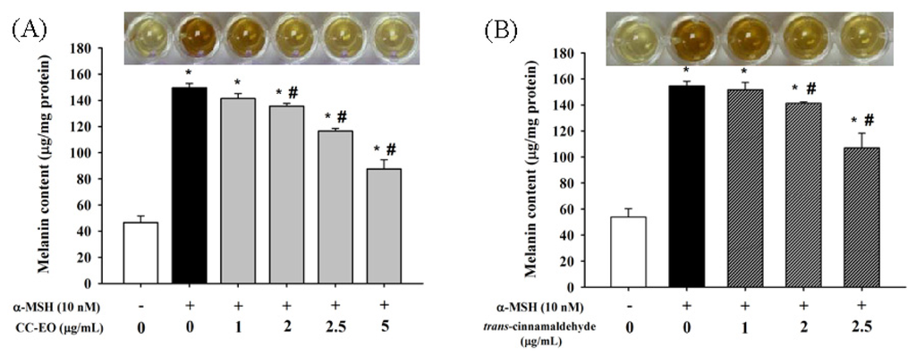 To evaluate the effects of CC-EO and cinnamaldehyde on melanin production and tyrosinase activity, the B16 melanoma cells were exposed to α-MSH (10 nM) for 72 h in the presence of either CC-EO at 1.0, 2.0, 2.5, or 5.0 μg/mL or cinnamaldehyde at 1.0, 2.0, or 2.5 μg/mL. Following this exposure, the melanin content and tyrosinase activity were measured. The amounts of melanin were sharply increased by approximately three-fold upon exposure to α-MSH for 72 h (Figure 2). However, co-treatments with CC-EO (Figure 2A) or cinnamaldehyde (Figure 2B) significantly inhibited α-MSH-stimulated melanin production in a dose-dependent manner. In particular, compared with the α-MSH alone treatment, the co-administration of 5.0 μg/mL CC-EO (Figure 2A) and 2.5 μg/mL cinnamaldehyde (Figure 2B) significantly reduced melanin production by 42% and 31%, respectively.