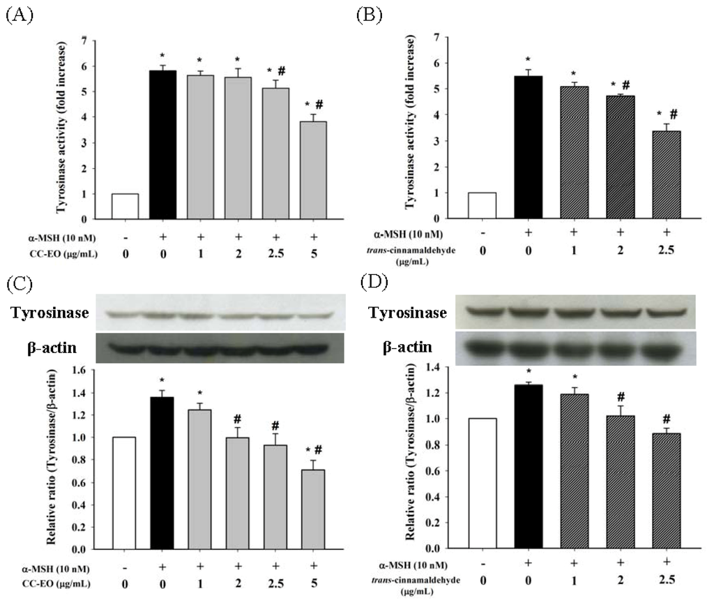 Melanogenesis is regulated by the activity of tyrosinase, which is a rate-limiting enzyme in melanin biosynthesis. Thus, the effects of CC-EO or cinnamaldehyde on tyrosinase activity in α-MSH-stimulated B16 melanoma cells were examined. As shown in Figure 3A,B, approximately a five- to six-fold increase in cellular tyrosinase activity was observed in α-MSH-stimulated cells compared with unstimulated control cells. However, treatments with CC-EO and cinnamaldehyde dose-dependent reduced the tyrosinase activity in α-MSH-stimulated B16 melanoma cells. To clarify the further mechanism of tyrosinase inhibition by CC-EO and cinnamaldehyde, the levels of tyrosinase expression in B16 cells were examined by Western blot analysis. The levels of tyrosinase protein were 1.3-fold higher in the α-MSH-stimulated B16 melanoma cells than in the unstimulated control cells (Figure 3C,D). Treatments with both CC-EO and cinnamaldehyde suppressed the α-MSH-induced expression of tyrosinase in a dose-dependent manner. These results indicated that CC-EO and its major constituent, cinnamaldehyde, suppressed α-MSH-stimulated melanogenesis in murine B16 melanoma cells through non-cytotoxic mechanisms that involved the inhibition of tyrosinase activity and the down-regulation of tyrosinase expression, consequently leading to decreases of melanin content.