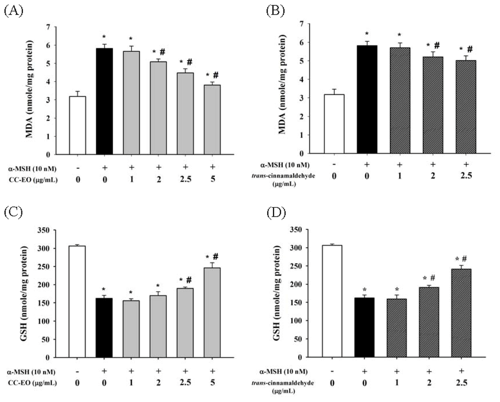 First, the lipid peroxidation through the production of MDA was measured to determine the cellular oxidative stress that was induced by α-MSH. Compared with unstimulated control cells, cells that were exposed to α-MSH exhibited a 1.8-fold increase in cellular MDA formation. However, treatments with CC-EO and cinnamaldehyde resulted in a dose-dependent attenuation of the α-MSH-stimulated formation of cellular oxidants (Figure 4A,B). The GSH level is important for maintaining cellular redox status and plays an important role in the inhibition of melanogenesis [35]. Our data indicated that compared with unstimulated control cells, stimulation by α-MSH caused a 47% decrease in GSH levels (p < 0.05); however, a dose-dependent recovery of α-MSH-reduced GSH levels was observed in the presence of CC-EO and cinnamaldehyde (Figure 4C,D).