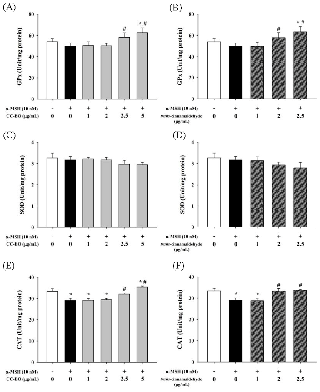 The effects of CC-EO and trans-cinnamaldehyde on GPx (A,B); SOD (C,D) and CAT (E,F) activities in α-MSH-treated B16 cells, respectively. The data are represented as the means ± S.D. of three independent experiments. * indicates a significant difference (p < 0.05) compared with the untreated group; # indicates a significant difference (p < 0.05) compared with the α-MSH-treated group.