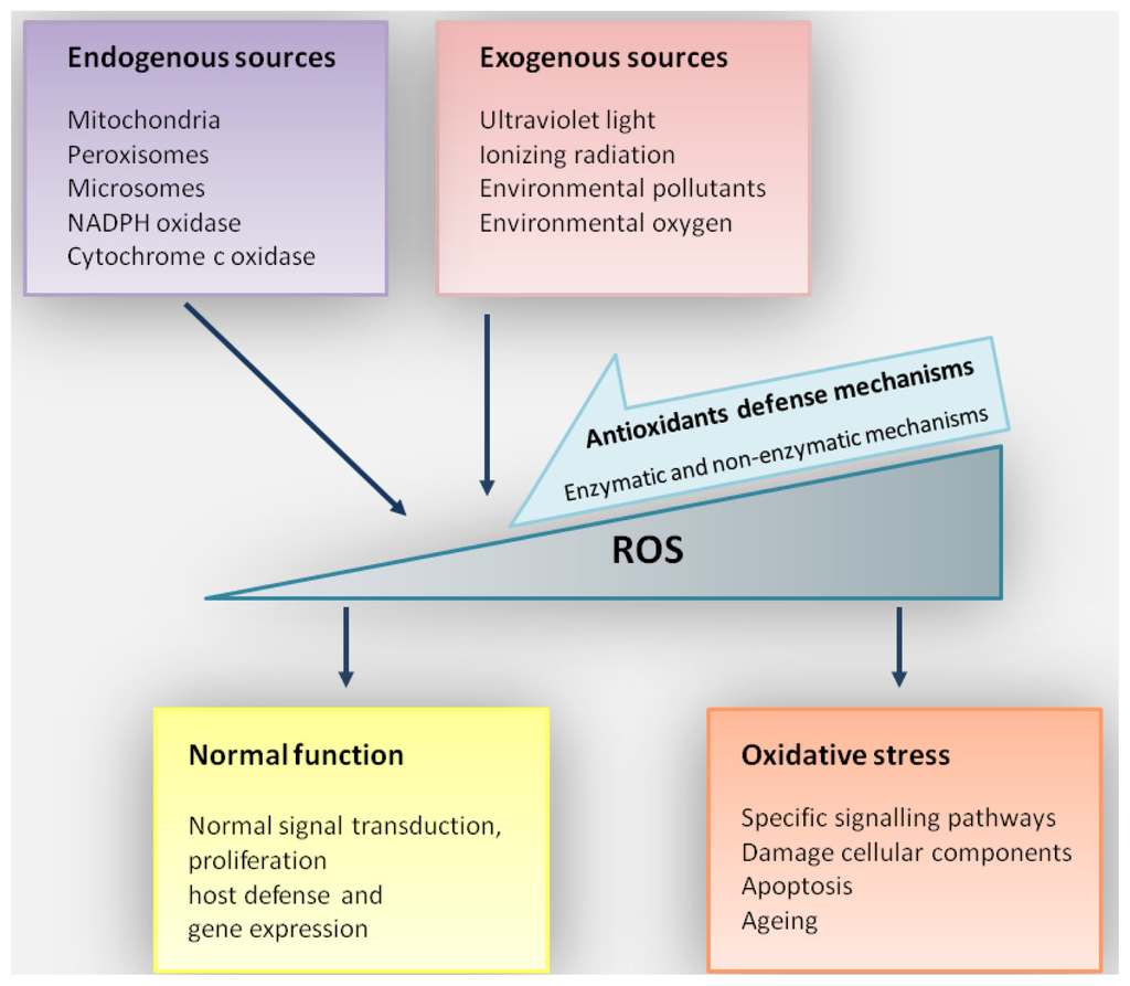 Cellular response to reactive oxygen species (ROS). ROS can be produced endo- or exogenously. The level of ROS, represented by grey triangle, is regulated by antioxidants defense mechanisms. Low levels of ROS production are required to maintain physiological functions, including: proliferation, host defense, signal transduction and gene expression. Under normal conditions, antioxidant defense mechanisms (including enzymatic antioxidants non-enzymatic molecules) decrease excess ROS and maintain cellular homeostasis. However, overproduction of ROS generates oxidative stress, leading to senescence, damage to cellular components, modulation of signal transduction pathways and apoptosis. Sometimes a reduced efficiency of antioxidant mechanisms may not be sufficient to decrease ROS level to physiological concentration.