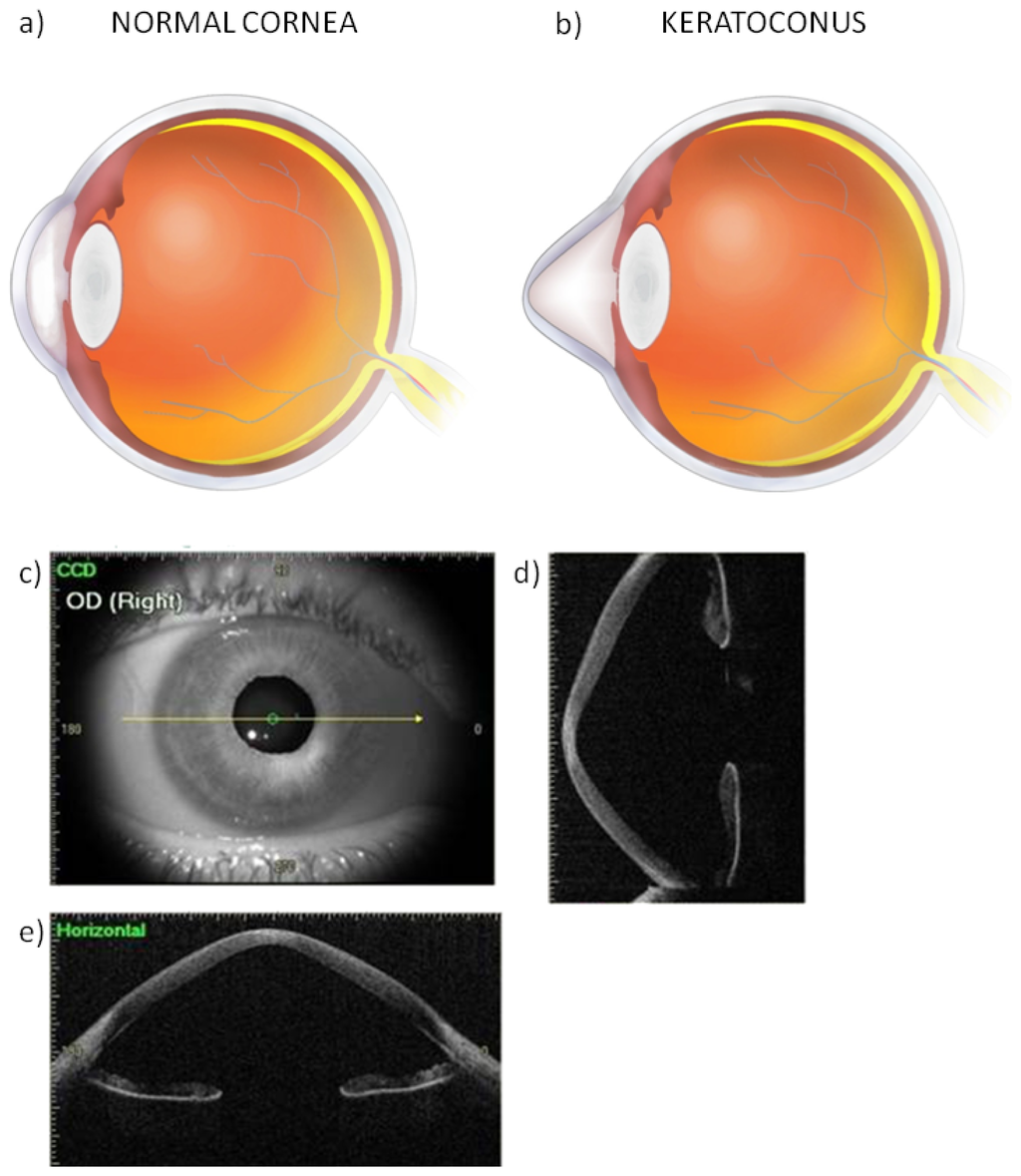 Diagrammatic comparison of normal cornea (a) and keratoconus cornea (b) along with images of keratoconus corneal thickness and elevation measurements obtained in swept-source optical coherence tomography (OCT) (c–e) of a patient from the Department of Ophthalmology, Medical University of Warsaw, Warsaw, Poland. The images present the vertical (d) and horizontal (e) images of OCT.