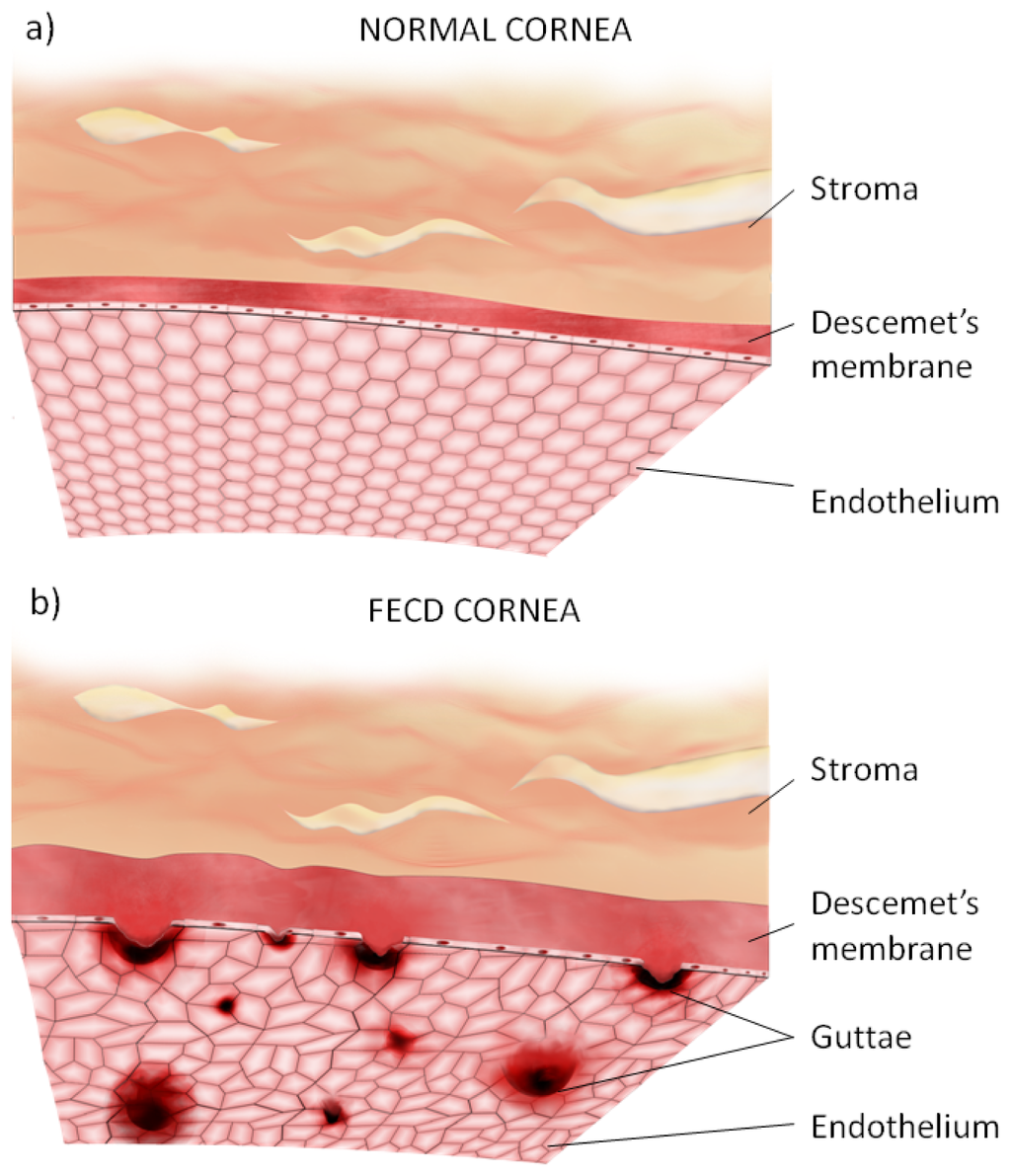 FECD is a disorder caused by degeneration of the corneal endothelium. The disease typically affects both eyes in the fourth or fifth decade of life [57]. It affects approximately 4% of the population over 40 years of age. However, the incidence of FECD is higher in the European population compared to other parts of the world [58]. FECD is characterized by the formation of excrescences in the Descemet’s membrane called cornea guttae (Figure 3) [59,60]. In the early stage of the disease, guttae are located in the central cornea. As the disease progresses, excrescences grow and spread towards the periphery cornea with concomitant loss of hexagonal shape and density of endothelial cells [61,62]. Corneal endothelium plays an important role in the regulation of transport of the corneal stromal fluid [63]. Endothelial cells regulate the uptake of solutes and nutrients by the cornea via diffusion and secondary active transport mechanisms [61,64]. Furthermore, ion transport in the endothelium is responsible for fluid secretion from the stroma to the aqueous [64]. In the physiological state, leak of fluid into the cornea is continuously counterbalanced by the fluid transport that keeps the cornea in a relatively dehydrated state in order to sustain its transparency. Loss of endothelial cells density in FECD triggers loss of endothelial ion transport activity, causing their inability to maintain a proper fluid balance resulting in stromal and epithelial edema and subsequent loss of the clarity of the cornea [61,64]. Corneal dysfunction in FECD is manifested by progressive decrease in visual acuity and may lead to blindness [59].