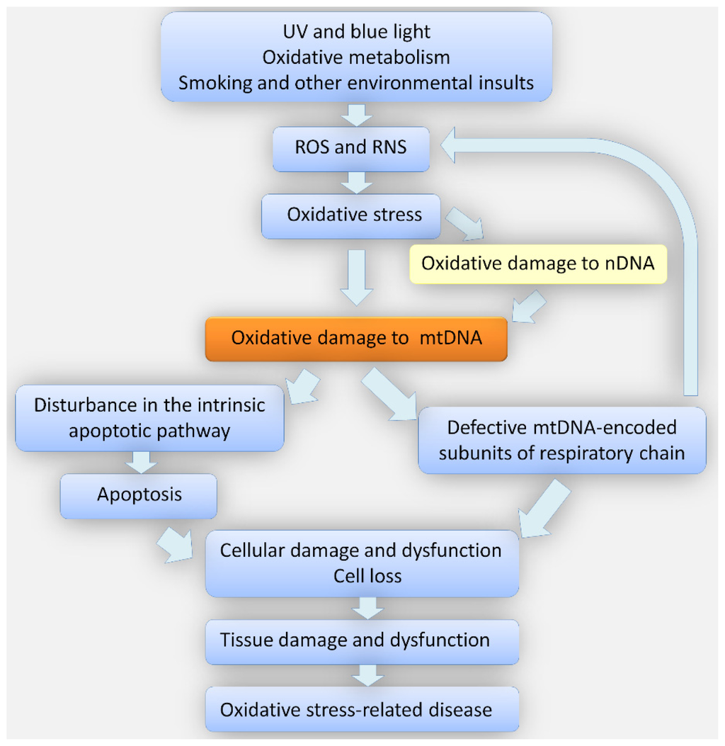 Environmental factors, such as UV radiation, may induce ROS/RNS, which in turn induce oxidative stress, resulting in further formation of reactive species, which may damage DNA (Figure 4). Mitochondrial DNA is especially prone to such damage due to its close proximity to the respiratory chain. However, the reaction of mtDNA to damage-inducing factors is mainly determined by proteins encoded by nuclear DNA. In turn, mtDNA damage may result in defective functioning of oxidative chain protein(s), producing an excess of ROS/RNS and increasing the extent of oxidative stress. On the other hand, damaged mtDNA may disturb signaling of the intrinsic apoptotic pathway. Altogether, damage to mtDNA and its nuclear counterpart caused by oxidative stress may lead to cellular damage and cell loss, resulting in tissue damage and dysfunction, and finally contributing to disease phenotype, including KC and FECD.