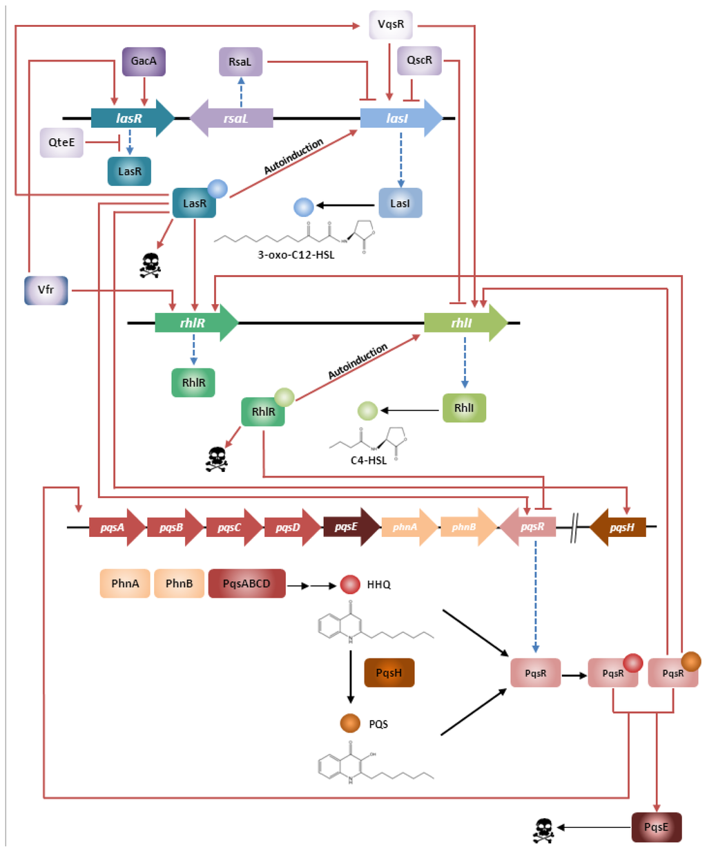 Quorum sensing (QS) in Pseudomonas aeruginosa. The hierarchical organisation of the two AHL-dependent QS systems in P. aeruginosa and its correlation with the P. aeruginosa quinolone signal (PQS) system is presented in the scheme below. (Skull represents virulence factor expression).