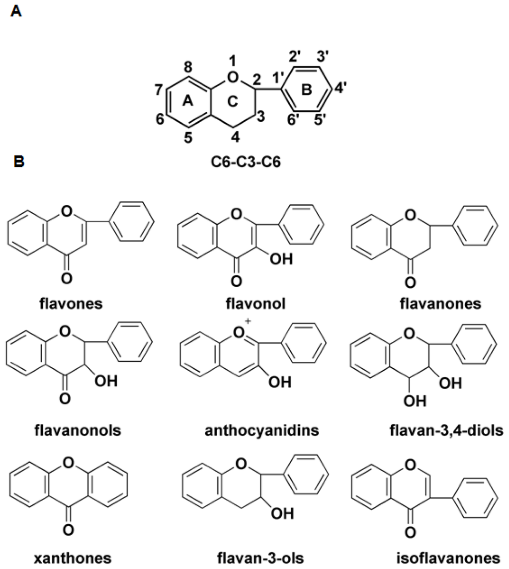 The structure of the flavonoids. (A) Flavan (C6–C3–C6) skeleton of flavonoids; (B) The oxidation status and saturation of the heterocyclic ring is used to classify the flavonoids.