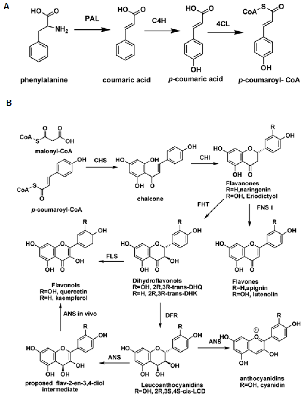 The biosynthesis pathway of flavonoids. (A) The biosynthesis of p-coumaroyl-CoA; (B) The biosynthesis of different kinds of flavonoids from p-coumaroyl-CoA and malonyl-CoA. PAL: Phenylalanine ammonia-lyase, C4H: Cinnamic acid 4-hydroxylation, 4CL: 4-Coumarate:Coenzyme A ligase, CHS: Chalcone synthase, CHI: Chalcone isomerase, FHT: Flavanone 3β-hydroxylase, FNS I: Flavone synthase I, FLS: Flavonols synthase, DFR: Dihydroflavonols reductase, ANS: Anthocyanidin synthase.