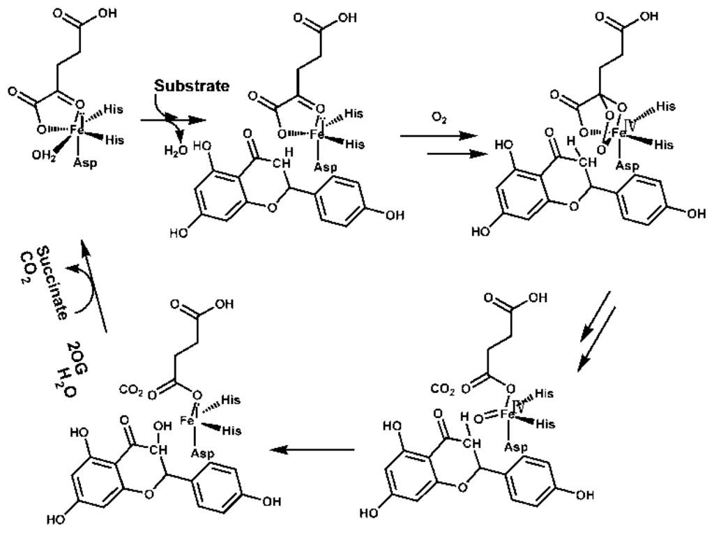 - Turnbull, J.J.; Nakajima, J.-I.; Welford, R.W.; Yamazaki, M.; Saito, K.; Schofield, C.J. Mechanistic studies on three 2-oxoglutarate-dependent oxygenases of flavonoid biosynthesis anthocyanidin synthase, flavonol synthase, and flavanone 3β-hydroxylase. J. Biol. Chem 2004, 279, 1206–1216. [Google Scholar]