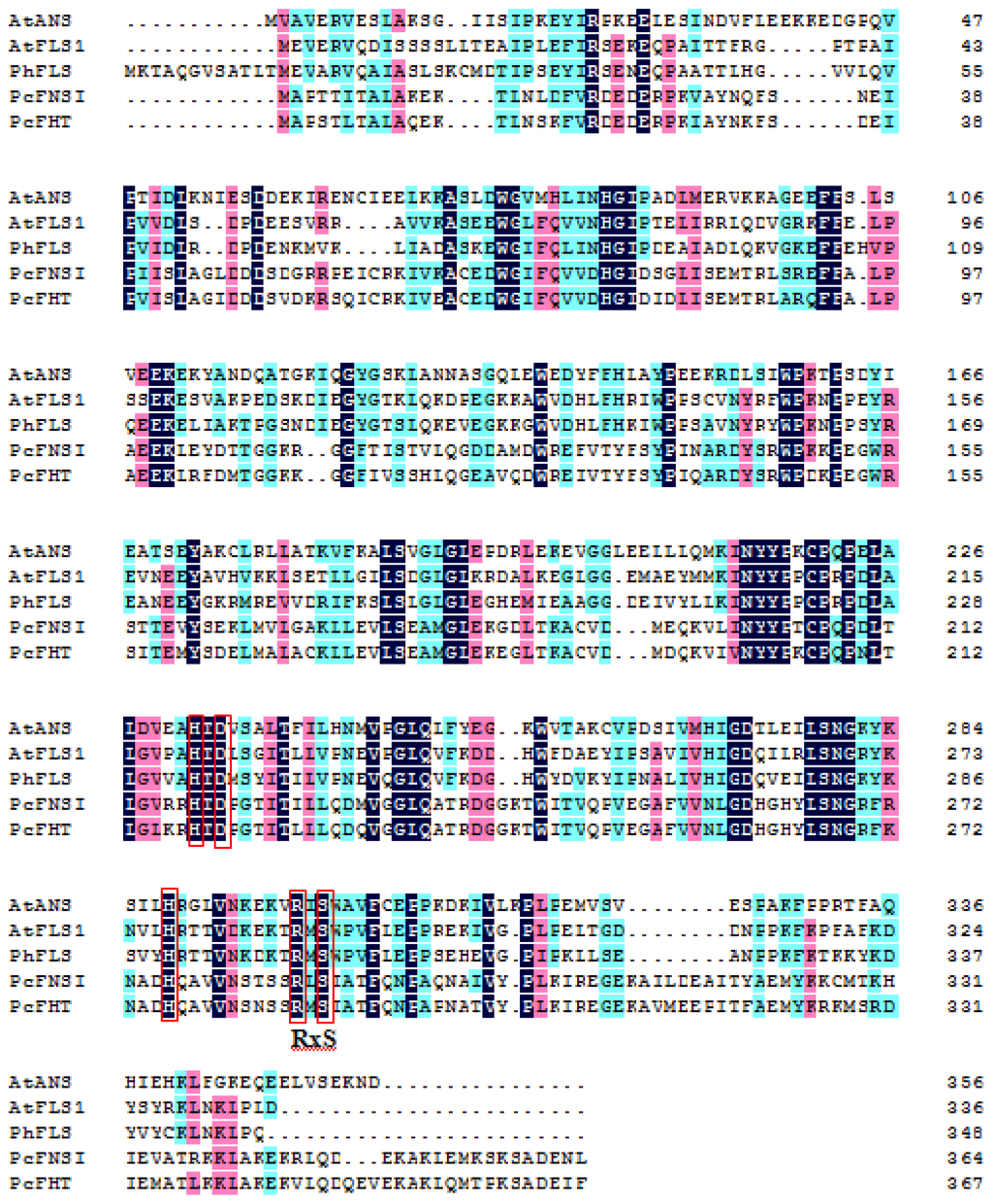 Alignment of the deduced amino acid sequence of different 2-ODDs. Multiple sequence alignment was calculated with the DNAMAN package. Black shading shows amino acid identities. The catalytic residues conserved in these 2-ODDs are indicated in red boxes. The abbreviations for species and accession numbers are: AtANS (Arabidopsis thaliana AJ564262), AtFLS1 (Arabidopsis thaliana AAB41504), PhFLS (Petunia hybrida CAA80264), PcFNS I (Petroselinum crispum AY817680), and PcFHT (Petroselinum crispum AY230248).