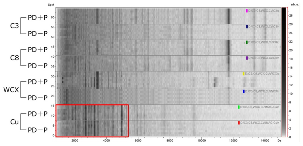 Protein profiles obtained with various chemical affinity beads. Peptides and proteins were captured by magnetic bead-based technology using C3, C8, weak cation exchange (WCX), and immobilized metal-affinity chromatography (IMAC-Cu) beads. In each panel, the compiled protein spectra from the PD + P and PD − P samples for each bead type are shown with the density plots of individual peritoneal dialysis effluent (PDE) profiles. X-axis, the calculated molecular mass (m/z values); Y-axis, relative intensity of specific samples. The differential density along the x-axis represents the specific peptide that distinctly presents in the samples. IMAC-Cu shows adequate protein profiles across all beads (labeled with a red frame).