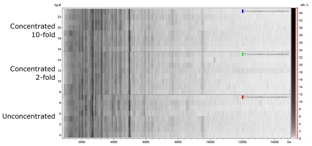 Protein profiles obtained with concentrated and unconcentrated samples. X-axis, the calculated molecular mass (m/z values); Y-axis, relative intensity of specific samples. Based on total signals count, unconcentrated samples consistently demonstrated a similar number of resolved fingerprints within the measured mass range of 1–15 kDa when compared with concentrated samples.