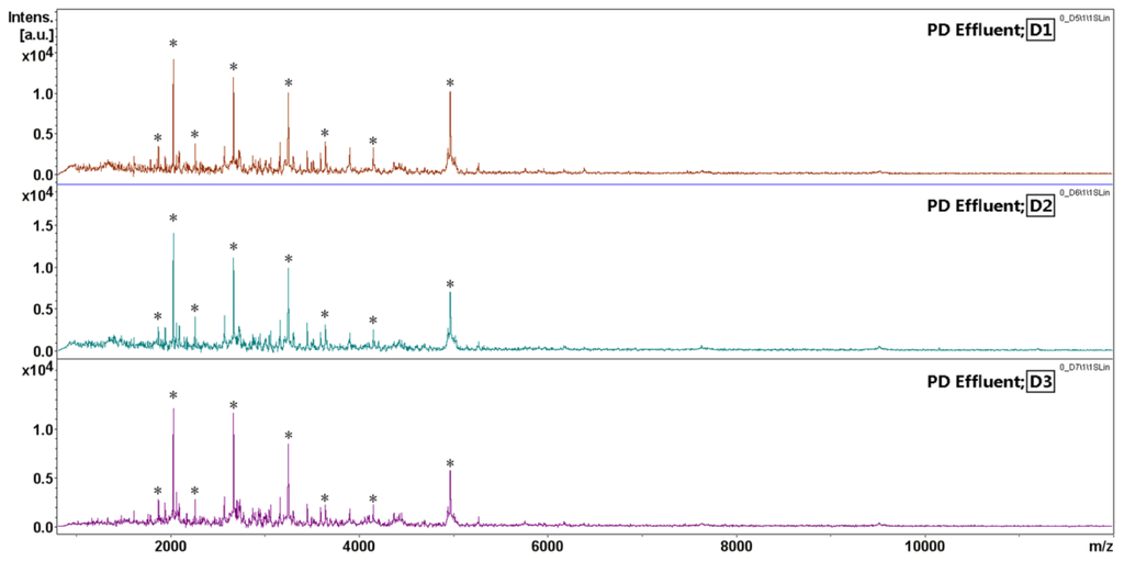 The intra-day reproducibility of PDE MALDI-TOF MS spectral fingerprints was evaluated. The PDE sample was spotted three times on SCOUT 600 μm AnchorChip at target positions D1, D2, and D3. The PDE fingerprints with high, medium, and low abundance signals within the mass range of m/z 1–15 kDa were randomly selected and marked with asterisks for a variability assessment (Figure 3). Acquired spectra from replicate analyses (n = 3) exhibited sufficient reproducibility for semi-quantitative analysis. The variability of each MS signal area was measured by the coefficient of variance (CV). Despite varying peptide masses and spectrum intensities, the CVs were 4%–23% with an average intra-day variability of 10% (Table 3), which indicates that results produced by this method are highly reproducible for the analysis of PDE samples.