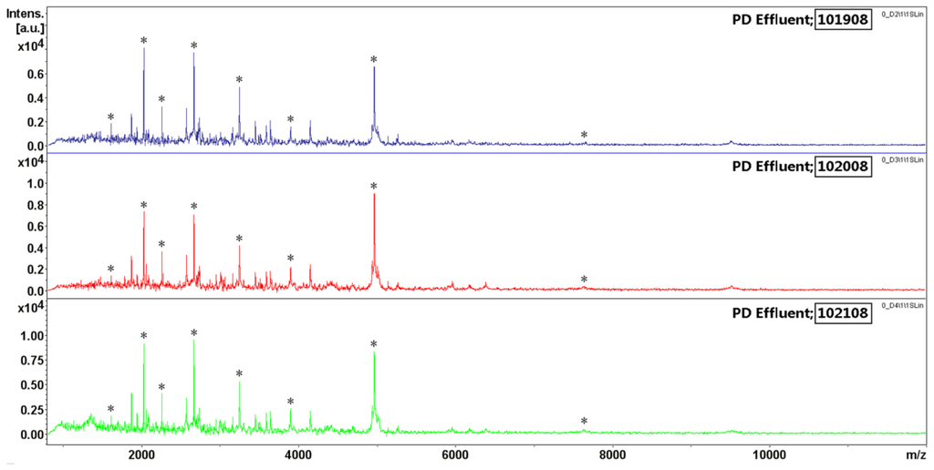 The current study used magnetic bead separation and MALDI-TOF MS for screening peptides and small proteins between the 1–15 kDa mass ranges. To date there was no previous study to describe the application of this technology in PD and the PDE sample. Proteomic analysis of PDE can be considered as a sophisticated process because PDE has a diluted protein concentration, high levels of salts and glucose, and more importantly, contains high-abundance proteins, including albumin and IgG, which interfere with the identification of proteins with low abundance profiles. Therefore, the aim of this study is to develop an optimal method to prepare reproducible and consistent separation of PDE proteome in the low molecular weight region.