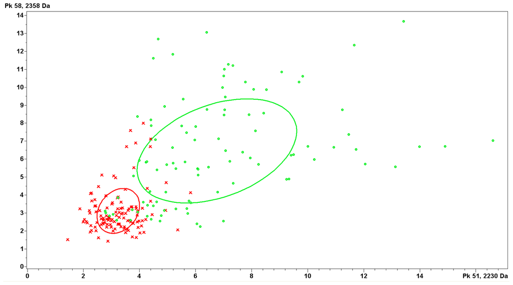 Discrimination features of peptides with m/z 2230 (x-axis) and 2358 (y-axis) between the patients with peritonitis (red cross) and control group (green circle).