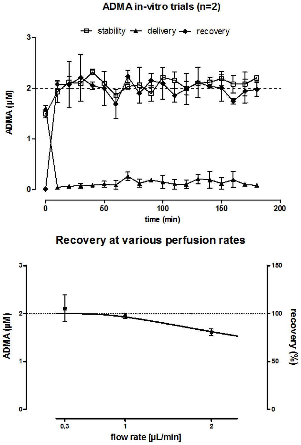 In vitro microdialysis. Stability, recovery and delivery experiments revealed stable asymmetrical dimethylarginine (ADMA) concentrations after approximately 20 min of catheter perfusion (upper panel, “equilibration period”). Recovery rate decreased with increasing flow rate (lower panel). Data are presented as mean and SEM of two independent experiments.