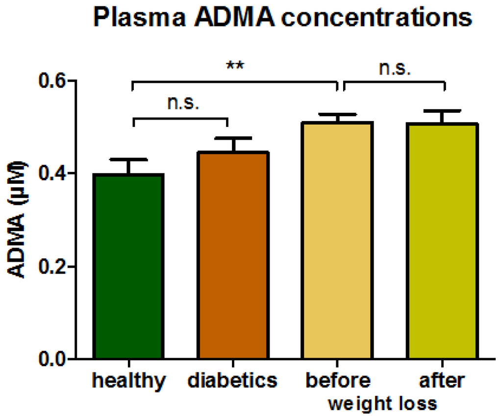ADMA in plasma samples. Concentrations were 0.40 ± 0.03 μM in healthy subjects; 0.44 ± 0.03 μM in diabetics; 0.51 ± 0.02 μM before and 0.51 ± 0.03 μM after weight loss in morbidly obese subjects (** p < 0.01 healthy vs. morbidly obese; n.s.: not significant).