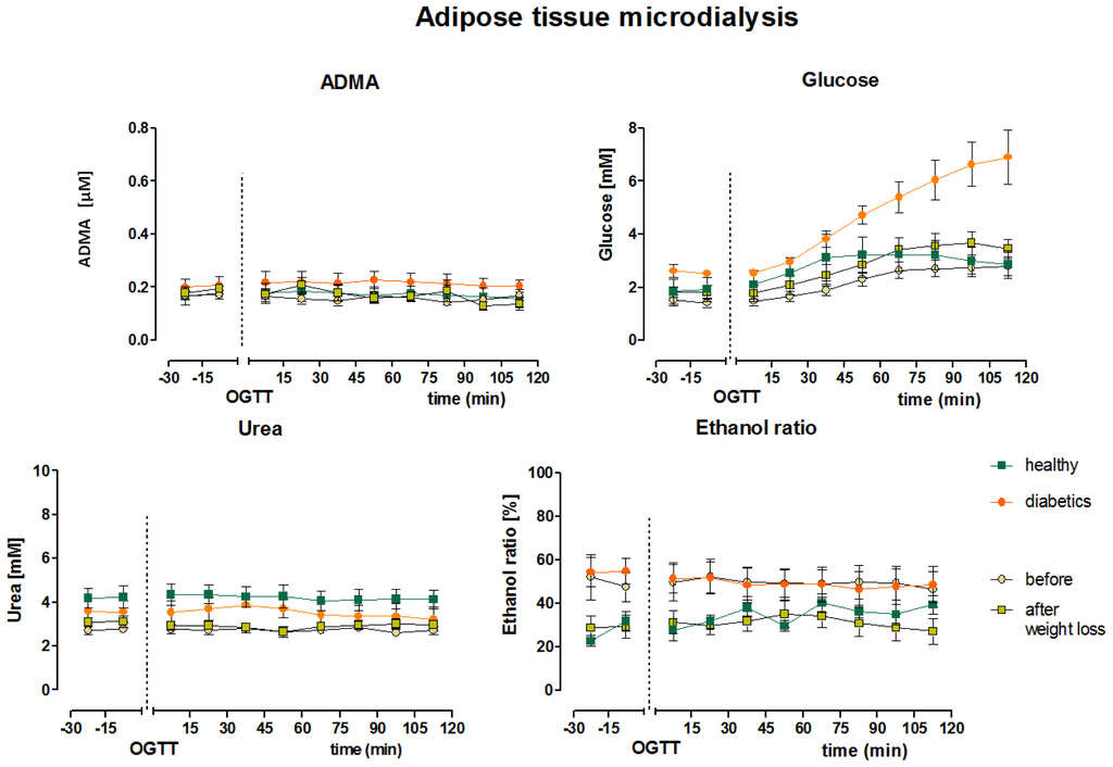 Clinical microdialysis (MD). Interstitial baseline ADMA values did not differ between the groups (lean healthy 0.17 ± 0.03 μM; diabetic 0.21 ± 0.03 μM; morbidly obese 0.16 ± 0.01 μM before surgery, and 0.17 ± 0.01 μM after weight loss). Interstitial glucose increased after oral glucose ingestion while ADMA, urea and ethanol ratio were not affected. (OGTT= oral glucose tolerance test).