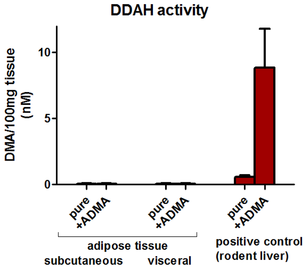 Subcutaneous and visceral adipose tissue DDAH activity was close to the lower limit of detection with no difference between the depots (subcutaneous adipose tissue: 0.2 ± 8.0 and visceral adipose tissue 1.9 ± 5.0 fmol DMA/min × mg). Compared to liver (8237 ± 2860 fmol DMA/min × mg), adipose tissue DDAH activity is negligible (Figure 4).
