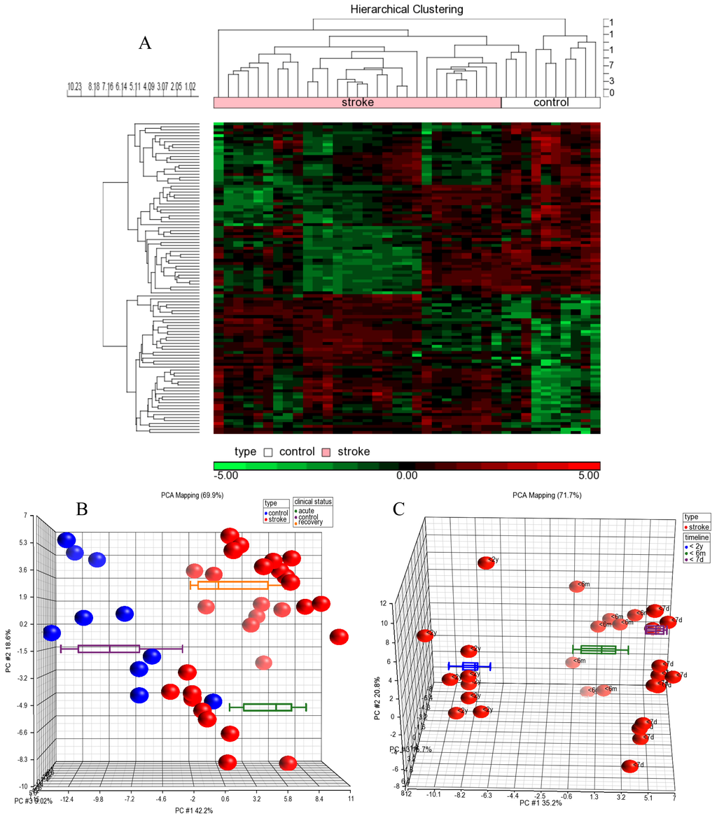 Cluster plots of miRNA profiles. (A) Hierarchical clustering of miRNA profiles. miRNA profiling data showed that control samples were clustered away from stroke patients. The upregulated miRNAs are shown in red and downregulated miRNAs are shown in green; (B) Principal Component Analysis (PCA) and Box-whisker plots. PCA analysis showed segregation of controls (blue circles) away from stroke (red circles) patients. Box-whisker plots showed that the samples segregated into three absolute categories; healthy controls (purple box-whiskers), acute stroke (green box-whiskers) and “recovered” stroke patients (orange box-whiskers); and (C) PCA plots with time-based segregation. Clustering of stroke samples reflected temporal evolution of miRNAs in stroke patients (purple box-whiskers < 7 days; green box-whiskers < 6 months; blue box-whiskers < 24 months).