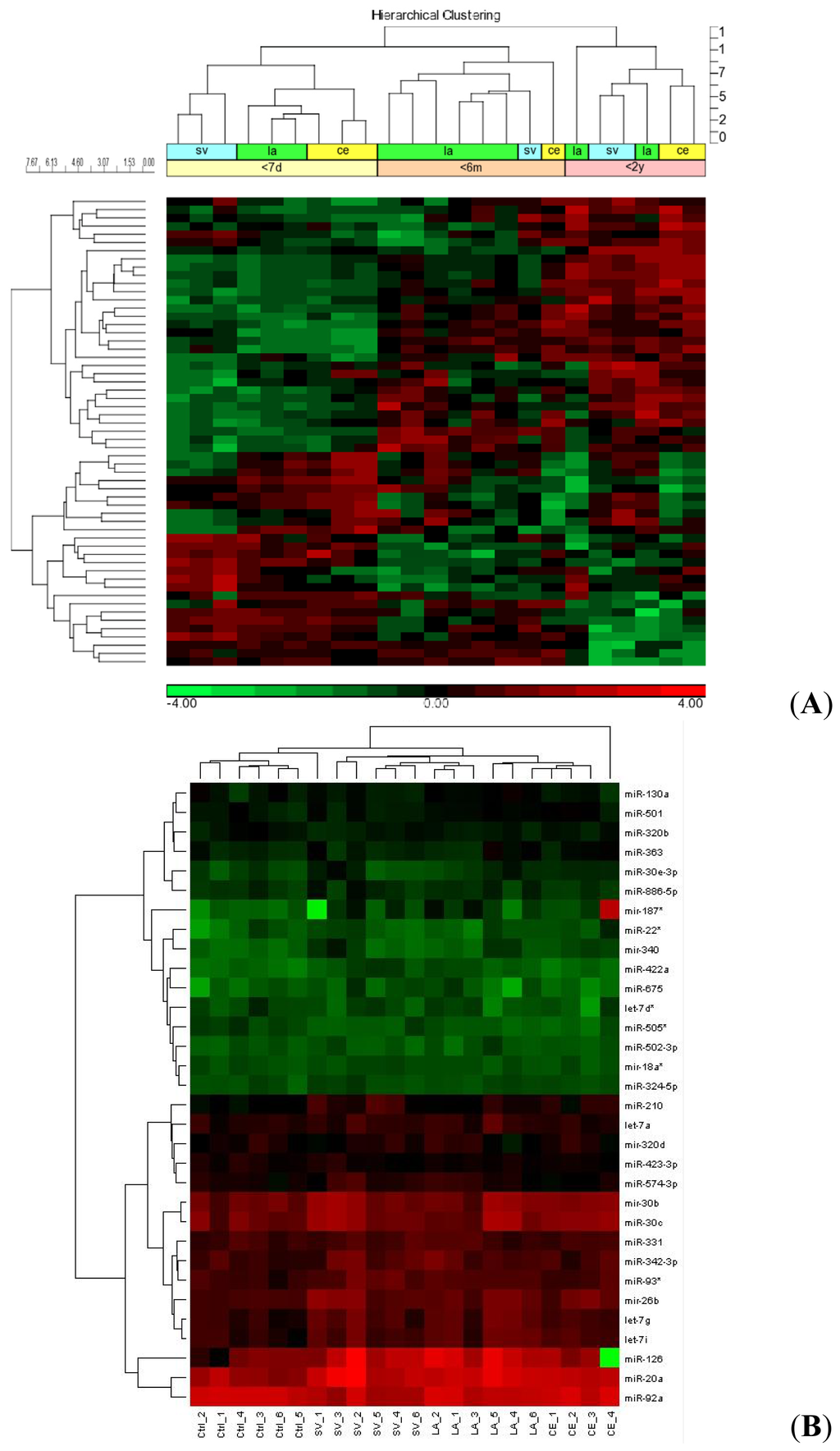 Additionally when the patients were grouped based on the TOAST classification, as large artery (LA), cardioembolic (CE) and small vessel (SV), 57 miRNAs (let-7a, let-7d*, let-7g, let-7i, miR-126, -1261, -1299, -130a, -1321, -135b, -184, -187*, -18a*, -208a, -214, -20a, -22*, -26b, -26b*, -27a*, -30b, -30c, -30e*, -320b, -320d, -324-5p, -331-3p, -340, -342-3p,-361-5p, -363, -370, -381, -422a, -423-3p, -494, -501-5p, -502-3p, -505*, -525-5p, -549, -552, -553, -574-3p, -574-5p, -585, -602, -611, -617, -627, -629, -675, -7, -886-5p, -92a, -93* and -96) were identified to be significantly dysregulated among them. Hierarchical clustering revealed that these 57 miRNAs could accurately distinguish stroke subtypes within six months from stroke onset (Figure 2A). These findings were further validated on randomly selected patients (n = 22) using a customized TaqMan Low Density Array (TLDA). Setting cycle threshold values (CT) of 32 as a cut-off, a final panel of 32 miRNAs (let-7a, let-7d*, let-7g, let-7i, miR-126, -130a, -187*, -18a*, -20a, -22*, -26b, -30b, -30c, -30e*, -320b, -320d, -324-5p, -331-3p, -340, -342-3p, -361-5p, -363, -422a, -423-3p, -501-5p, -502-3p, -505*, -574-3p, -675, -886-5p, -92a and -93*) that could significantly distinguish the stroke etiology was obtained. Hierarchical clustering showed that this panel of miRNAs could neatly segregate the patients according to their stroke subtypes and possibly aid in the classification of stroke etiologies (Figure 2B).