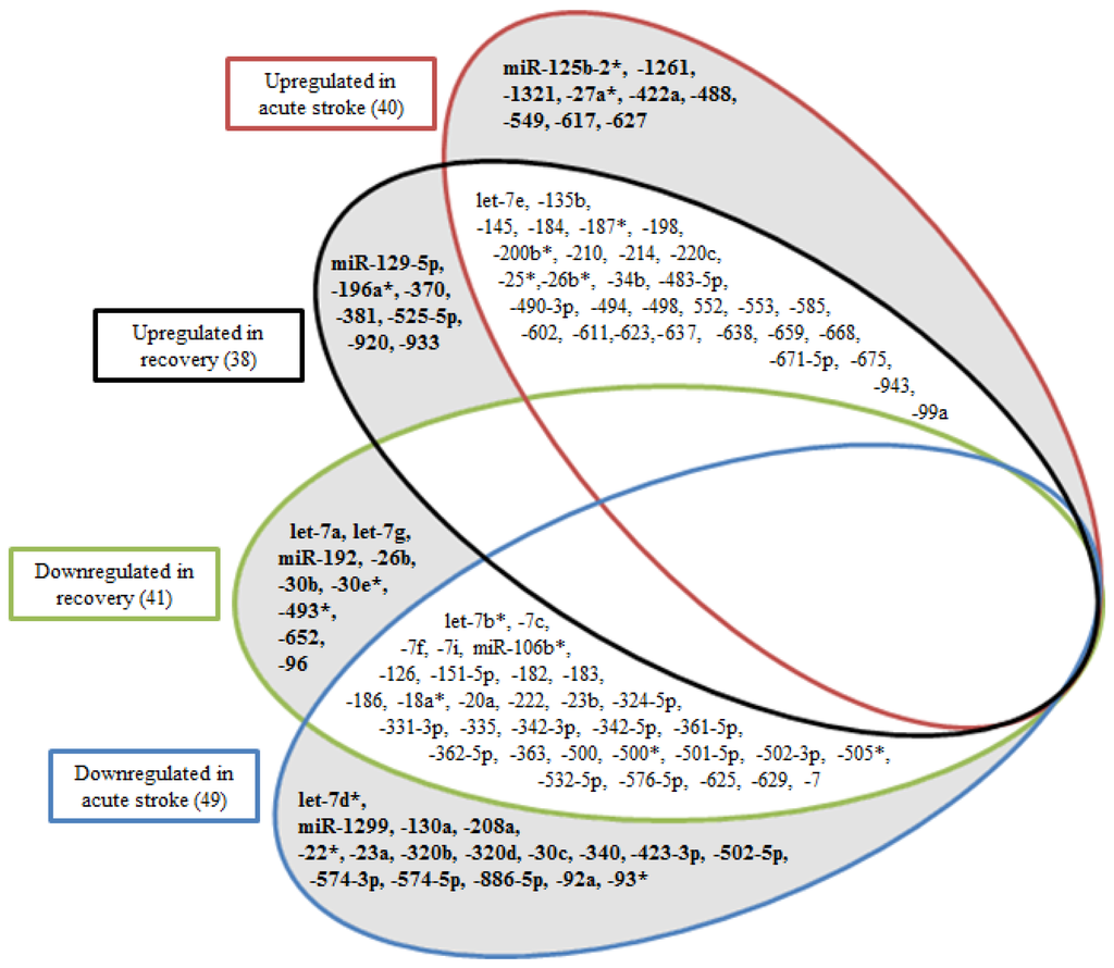 Differentially regulated miRNAs in stroke patients. miRNAs significantly altered (FDR p < 0.05) in acute stroke and recovery with respect to healthy controls are shown here. miRNAs unique to acute phase or recovery phase are represented in shaded regions in bold whereas those common to both categories are listed in the clear areas of the diagram.