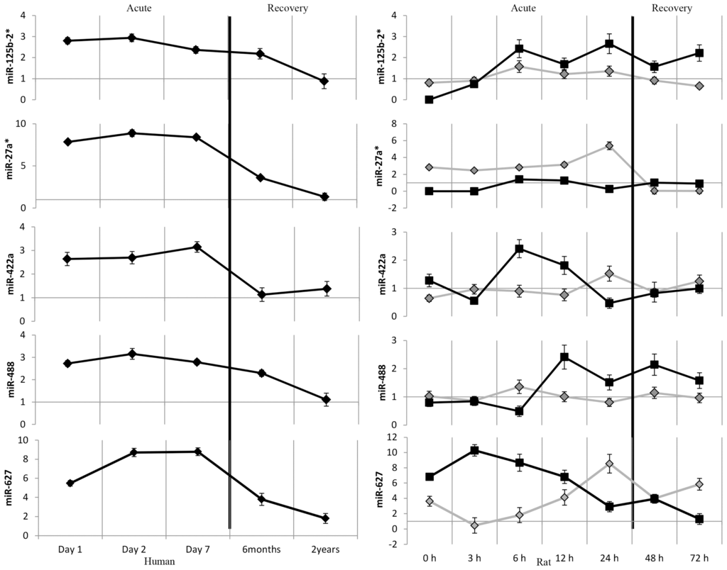 Analysis of the expression profiles of miR-125b-2*, -27a*, -422a, -488 and -627, from stroke onset till recovery of two years showed that their highest expression occurred within the acute phase (one to seven days) of stroke in humans (Figure 4). To establish that their changes in expression were a consequence of the onset of stroke, an in vivo study using rat models was carried out. Rats subjected to Middle Cerebral Artery occlusion (MCAo) were sacrificed over a period of 0 h to 3 days. Changes in the miRNA expression in blood and brain were determined. In the brain samples, the highest expression for all the 5 miRNAs was observed within the acute phase (0 to 24 h). miR-125b-2* and miR-488 peaked at 6 h from the onset of stroke, to 1.56 ± 0.28 and 1.36 ± 0.24 fold, respectively in ischemic rat brain whereas miR-27a*, -422a and -627 peaked at 24 h from the onset of stroke, to 5.37 ± 0.46, 1.52 ± 0.28 and 8.53 ± 1.23 fold, respectively (Figure 4). The corresponding expression of these miRNAs was also at maximum levels in the rat blood, during the acute phase. miR-125b-2* blood profile showed similar expression to that of the ischemic brain, albeit with greater fold change differences. Incidentally, miR-125b-2* was shown to be conserved in the brain throughout the chimpanzee, macaque and human species, implicating its crucial functional roles in mammalian brain development []. In fact we also observed miR-125b-2* to have the strongest biomarker potential based on AUC values (Table 2). Except for miR-125b-2*, the remaining miRNAs exhibited an opposing profile in the brain and blood at their corresponding time points. Similar phenomenon was also observed in patients diagnosed with atherosclerotic abdominal aortic aneurysm []. Expression of miR-29b, -124a, -155 and -223, that were significantly increased in the atherosclerotic abdominal tissue was reduced in circulation. Similarly, miR-92a levels were found increased in acute myeloid and lymphoblastic leukemia cells, and decreased in circulation [], suggesting complex regulatory processes occurring via the circulatory system.