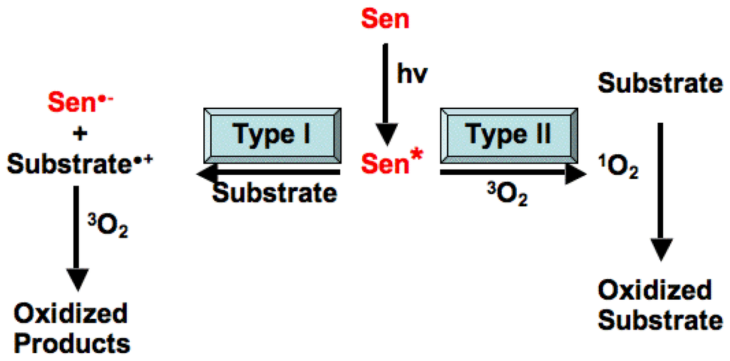 Type I and II chemical photosensitization. Type I: the activated sensitizer reacts with the acceptor, in a one-electron transfer reaction, to produce a radical ion in both the sensitizer and eventually in the acceptor. The acceptor (substrate) donates an electron to the sensitizer (Sen), resulting in an acceptor radical cation (Substrate+) and a sensitizer radical anion (Sen•−), but the opposite may also occur, depending on the redox potential of the pair of molecules. In the presence of oxygen, both of these radicals can proceed to produce oxygenated products. Type II reactions: activated sensitizer transfers its excess energy to ground state molecular oxygen, producing excited state singlet oxygen and regenerating the ground-state sensitizer. Singlet oxygen then reacts with the acceptor to produce oxidized metabolites. Reprinted with permission of the author and publisher [24].