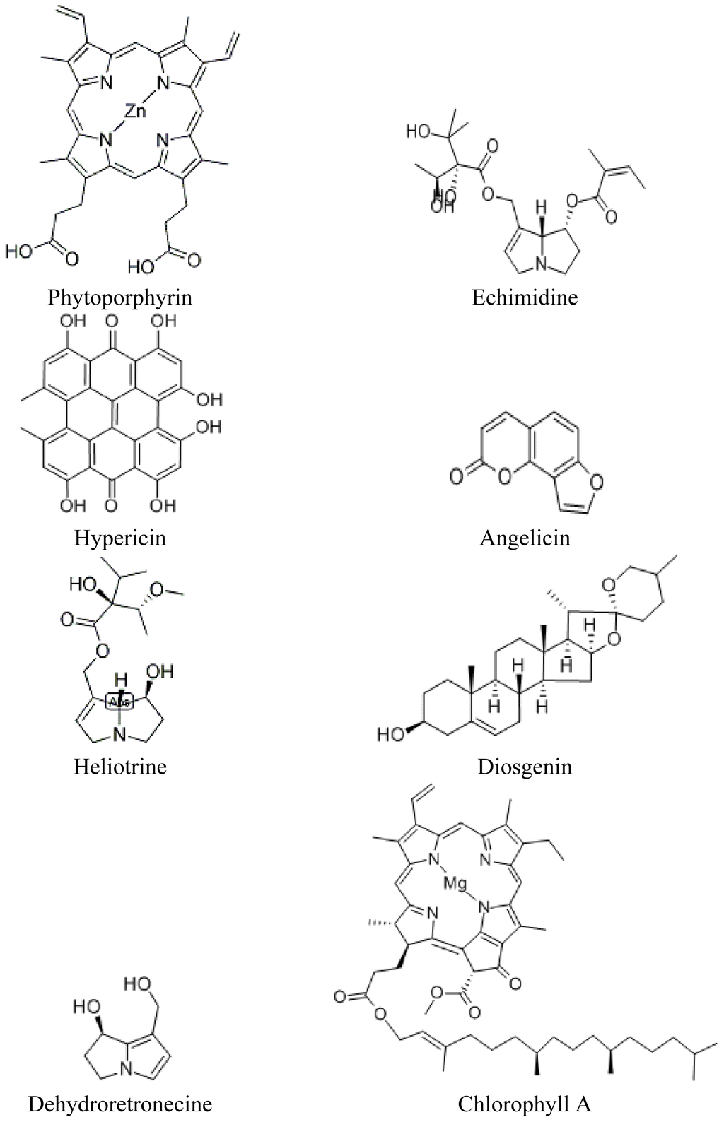 Selected chemical structures of SPPs causing photosensitization in grazing livestock, clockwise from upper left to right. Phytoporphyrin is a microbially produced breakdown product of chlorophyll. Echimidine is produced by Echium plantagineum. Angelicin is produced by Heracleum mantegazzianum. Diosgenin is produced by Panicum virgatum. Chlorophyll A is produced by all green plants. Dehydroretronecine is produced by Senecio spp. Heliotrine is produced by Heliotrope spp. Hypericin is produced by Hyperacum perforatum.