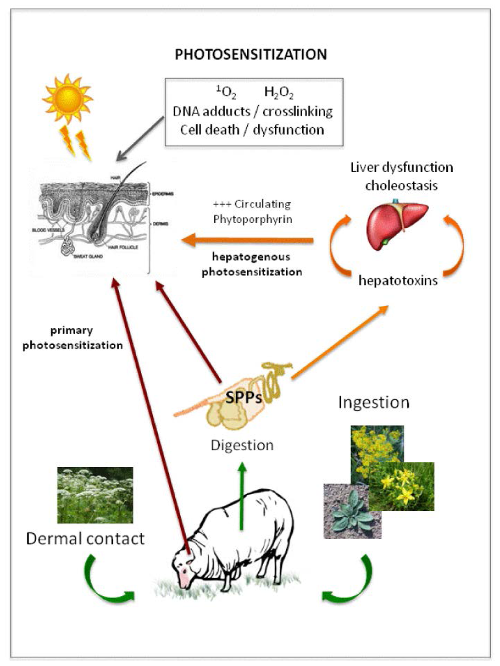 Photosensitivity in grazing herbivores is defined as either primary or secondary photosensitization by veterinary pathologists [15,19]. For the purposes of this review, we will use this nomenclature when referring to types of photosensitization in grazing herbivores. Primary photosensitization occurs when phototoxic plant-produced compounds or their metabolites become bioavailable within the animal after ingestion, or become localized in the cellular layers of the skin (Figure 3). This may be due to direct contact with the plant or from ingestion and dissemination in the herbivore to dermal tissues via absorption from the gut and dissipation in the circulatory system [15]. Primary photosensitization can also develop due to deposition of the products of abnormal porphyrin metabolism in the skin of grazing herbivores. This can arise due to disease resulting from gene mutations in certain mammalian systems that create deficiencies of enzymes involved in the production of hemoglobin, and will not be considered in further detail in this review [15]. Secondary hepatogenic (also referred to as Type 3) photosensitization results from the accumulation of the photodynamic compound phytoporphyrin through the circulatory system of the herbivore. Phytoporphyrin is a microbially-produced metabolite of chlorophyll and is normally cleared from the herbivore’s circulatory system by hepatic metabolism, however, secondary photosensitization may occur as a result of either acute or chronic liver damage in the affected animal when porphyrin and derivatives are not cleared by the damaged liver (Figure 3) [15,36,37].