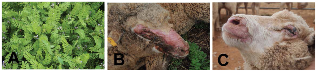 Biserrula pelecinus is an annual pasture legume native to the southern Mediterranean. It was first introduced to Australia in 1991 as a potentially valuable rotational pasture species for livestock production, particularly in low rainfall zones [105–107]. It produces large quantities of biomass, exhibits drought tolerance and is effective for weed suppression in pasture rotations. However, despite proving to be a valuable addition to the pasture toolbox, producers in Australia have reported incidence of severe photosensitization in sheep grazing on Biserrula pastures. Biserrula photosensitization, anecdotally, appears to be associated with a particular phase of crop maturity (late flowering) and shows an increased severity of clinical signs in naive or young animals grazing pastures predominating in biserrula. Two varieties of biserrula are currently in use in Australia, “Mauro” and “Casbah” [108,109]; previous reports and our own studies have shown both varieties cause photosensitization in sheep (Figure 4) [110]. The etiology of this photosensitization and the causal compound(s) are, as yet, unknown, however, rapidity in onset of symptoms and absence of significant liver pathology in affected animals suggests a primary photosensitizing agent may be responsible. Studies are ongoing to identify this agent and to further characterize the pathogenesis of photosensitization caused by this recently introduced species.