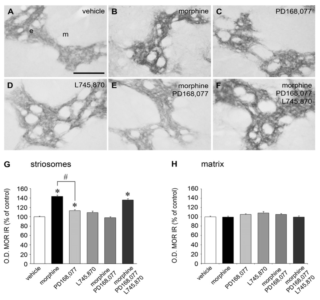 Effect of six days of continuous treatment with morphine (20 mg/kg/day), PD168,077 (1 mg/kg/day) and L745,870 (1 mg/kg/day) alone or combined on mu opioid receptor (MOR) immunoreactivity (IR) in the striosomes throughout the rostro-caudal axis of the rat CPu.