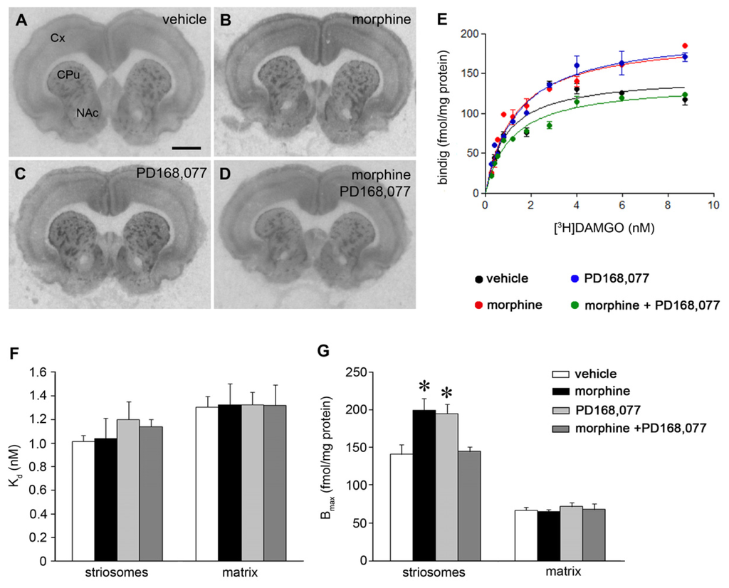 Co-administration of PD168,077 during continuous morphine treatment prevents the increase of [3H]DAMGO binding sites induced by the opioid drug. (A–D) Representative autoradiograms from coronal brain sections at the CPu level of rats which received six days of continuous treatment with vehicle (A), morphine (20 mg/kg/day) (B); PD168,077 (1 mg/kg/day) (C) and morphine + PD168,077 (D); Abbreviations: Cx, cortex; CPu, caudate putamen; NAc, nucleus accumbens. Scale bar is 2 mm. (E) Saturation curves of [3H]DAMGO binding in the striosomes; (F,G) Effect of drug treatments on Kd and Bmax values (mean ± SEM; n = 6) of [3H]DAMGO binding in the striosomes and matrix compartment of the rat CPu. * p < 0.05 vs. control and morphine + PD168,077 (one-way ANOVA followed by post hoc Bonferroni t-test).