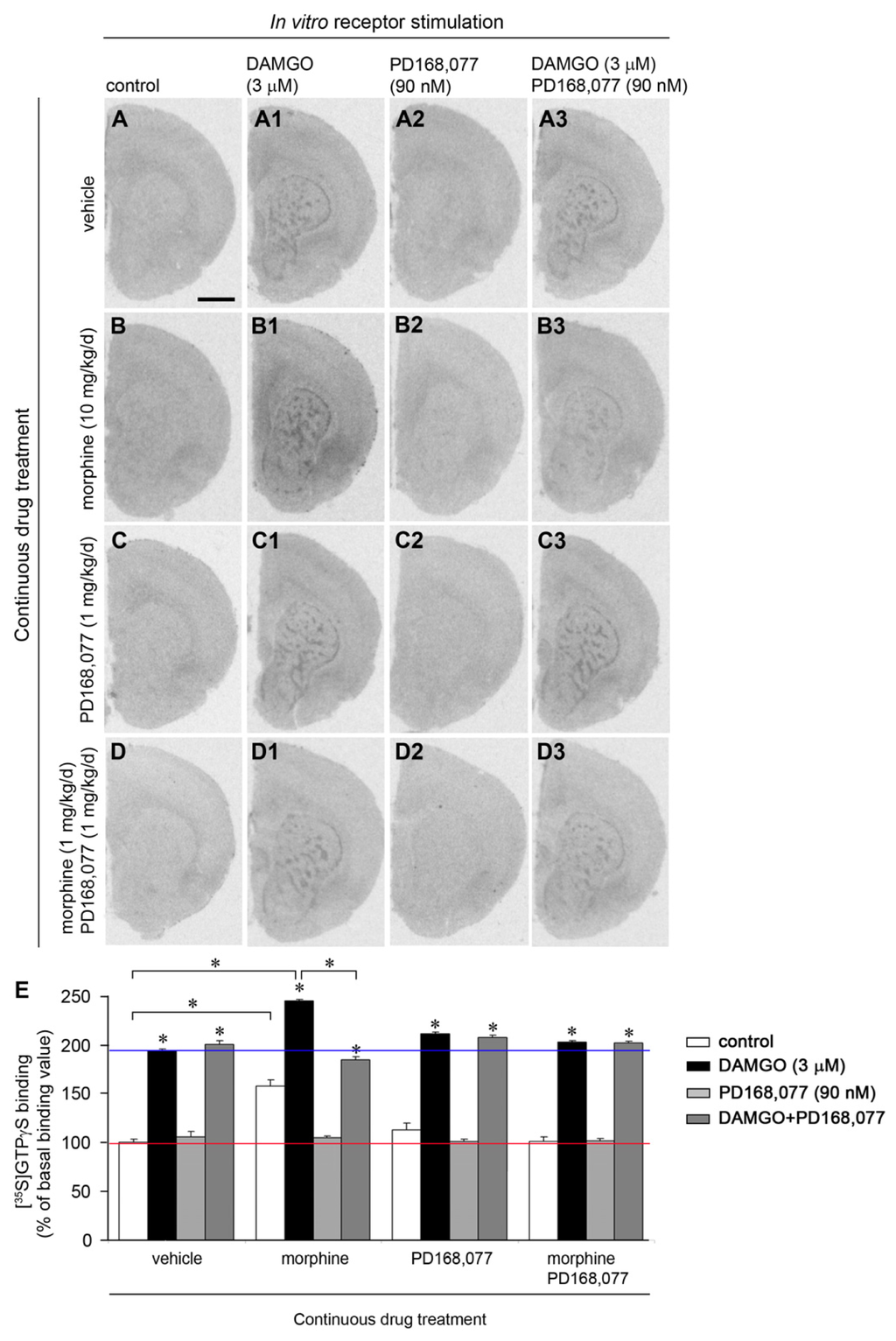 Sections from rat brains (n = 4–5 per treatment) were obtained as described before for the MOR autoradiography experiment. The sections were pre-incubated in assay buffer (50 mM Tris-HCl, 3 mM MgCl2, 2 μM EGTA, 100 μM NaCl, pH 7.4) for 15 min at RT and then in 2 mM GDP in assay buffer for 15 min. Sections were then transferred into assay buffer containing 0.2 mM GDP and 0.04 nM [35S]GTPγS with (stimulated) or without (basal) 3 μM DAMGO and/or 90 nM PD168,077 and incubated for 40 min at RT. Finally, the sections were rinsed twice in cold 50 mM Tris-HCl buffer and once in distilled water, dried and exposed to BioMax MR Film (Kodak, Rochester, NY, USA) for 48 h. Films were developed and digitized as described above. Gray values were measured from each section using the analyzing system ImageJ 1.44p (NIH, Bethesda, MD, USA), corrected by subtraction of the background gray value and converted to nCi/g using a 14C standard (GE Healthcare, Piscataway, NJ, USA).