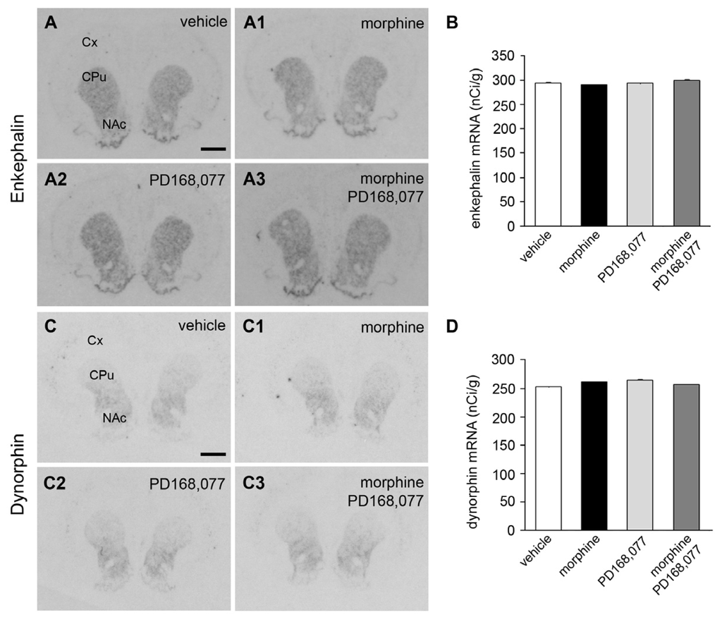 The effect of the six-day continuous treatment with morphine (20 mg/kg/day) and/or PD168,077 (1 mg/kg/day) on the expression of endogenous opioid peptides in the CPu was then studied by the determination of mRNA levels of Enk and Dyn using in situ hybridization. Autoradiograms showed in Figure 4 demonstrate that both Enk (Figure 4A–A3,B) and Dyn (Figure 4C–C3,D) mRNA levels were not affected by the different drug treatments.