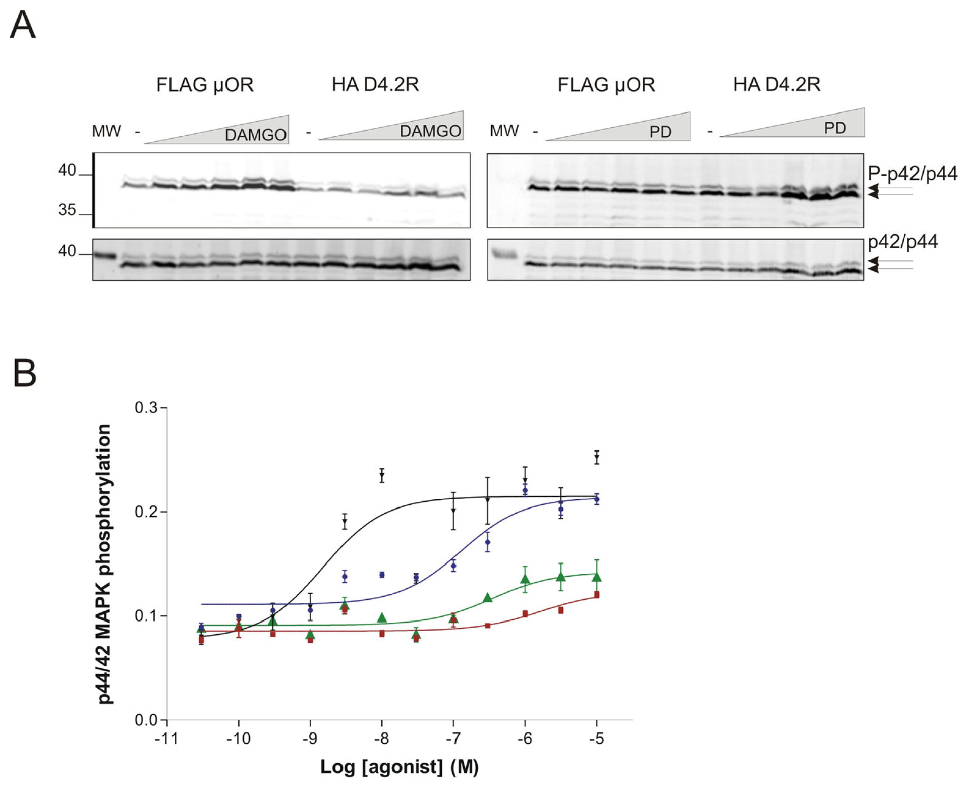 Dopamine D4 receptors and MOR are known to activate the mitogen-activated protein kinase (MAPK) signalling pathway, resulting in phosphorylation of p42/p44 [48,49]. Therefore, to investigate whether the dopamine D4 receptor agonist PD168,077 can act as an agonist or an inverse agonist of MOR, we performed two kinds of MAPK-phosphorylation assays, i.e., a Western blot immunodetection assay and an in-cell Western assay. First, HEK293T cells were transiently transfected with pHAD4.2R (as a positive control) and pFLAGMOR. Next, receptors were stimulated with different concentration of DAMGO (as a positive control for MOR expression) and of PD168,077 and phosphorylation of p42/p44 was determined (Figure S1). From both experiments, the Western blot immunodetection and the in-cell Western assay, we can conclude that PD168.077 activates the MAPK pathway when the dopamine D4 receptor is expressed and this already occurs at concentrations as low as 0.1 nM (Figure S1B). There is a small activation of p42/p44 upon MOR stimulation but only at high concentration (1 to 10 mM). The MOR is functionally expressed as DAMGO stimulates p42/p44 phosphorylation. Next, also DAMGO activates the dopamine D4 receptor at the highest concentrations (1 to 10 mM). The concentrations used to indicate that PD168,077 counteracts morphine-induced changes in MOR signaling are much lower (90 nM). Therefore we believe that the effect of PD168,077 on signaling via MOR is very low or even negligible.