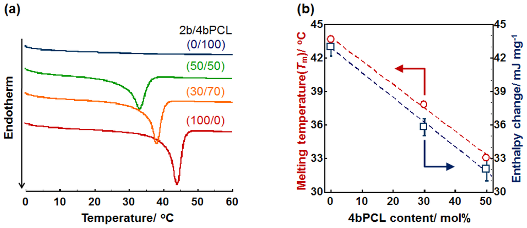 (a) DSC curves of crosslinked poly(ɛ-caprolactone) (PCL) films composed of 2b- and 4b-PCL; (b) The Tm and endothermic enthalpy change of crosslinked PCL films as a function of 4b-PCL content.